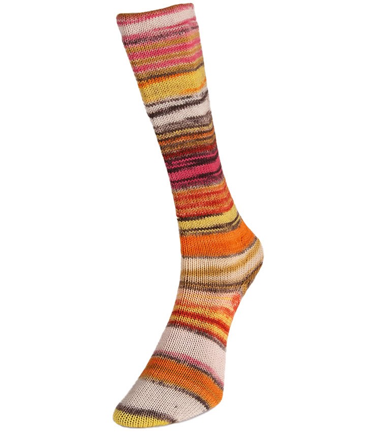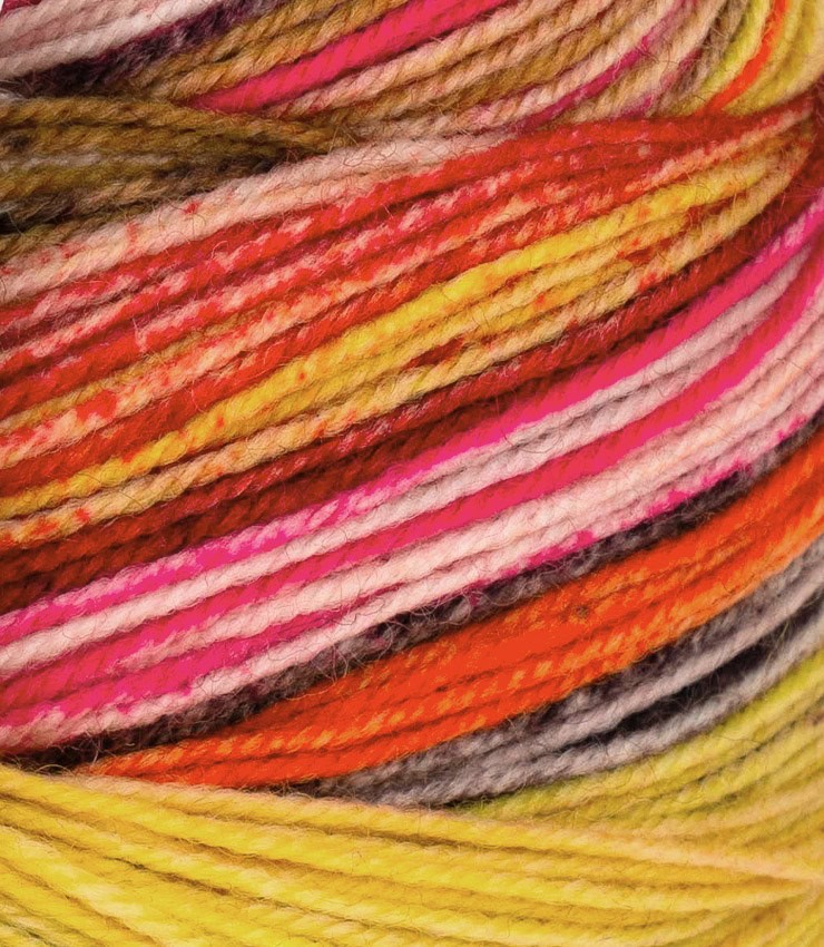 This yarn is designed to make two perfectly identical socks (up to size 46) using just one ball. This extraordinary result is made possible by the special Perfect Cycle printing, an advanced dyeing technique that organises colours in sequence to automatically reproduce the same pattern and motif on both socks.