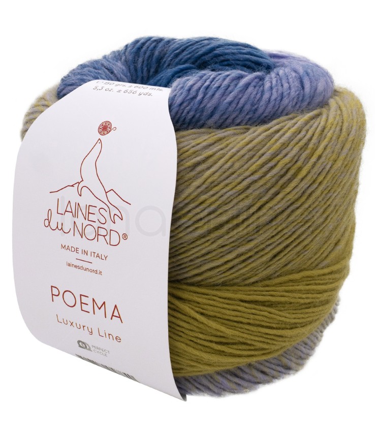 Il filato Poema della Laines Du Nord, interamente Made in Italy, è composto da Merino Extra Fine al 100% mulesing free con un effetto sfumato degradé che si sviluppa lentamente e uniformemente da un tono all’altro, durante la lavorazione di ogni gomitolo.