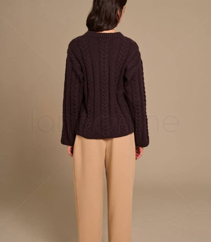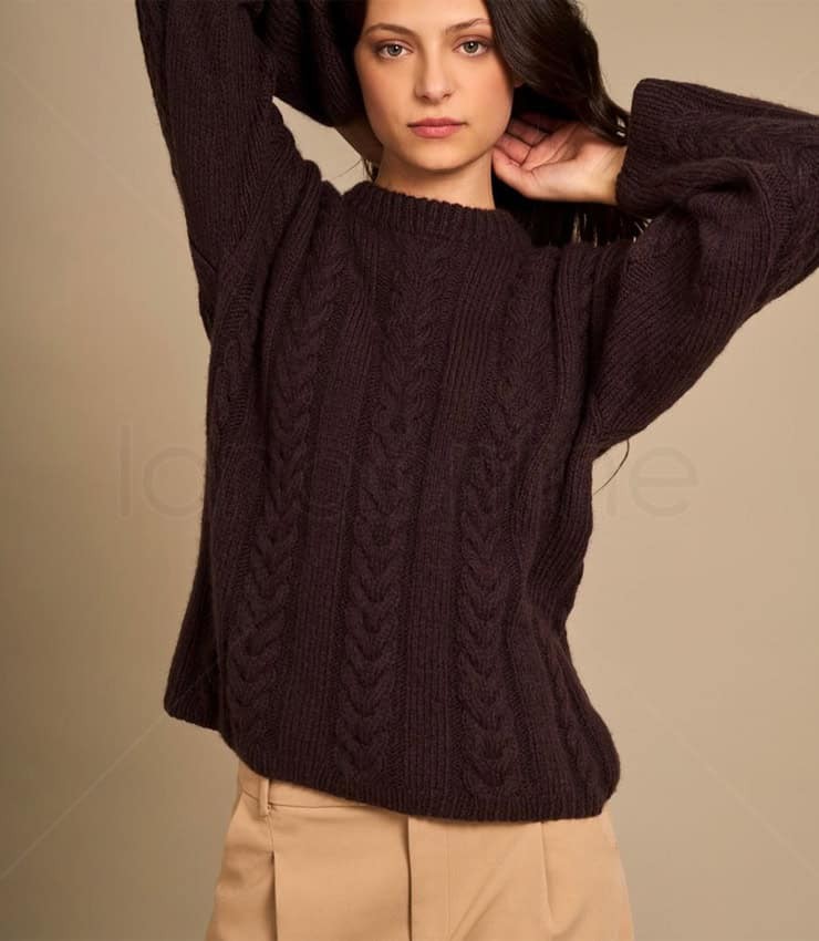 Schema gratuito per realizzare questo maglione con decorazioni a coste e trecce, il capo è stato lavorato con il filato Rozena di Laines du Nord.
