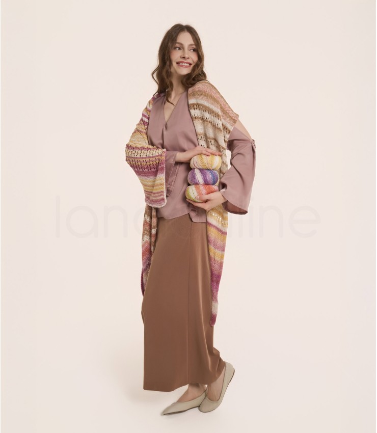 Schema gratuito per realizzare lo scialle. Il capo è stato lavorato a ferri con il filato Cotton Lux di Laines du Nord.
