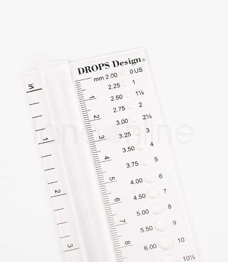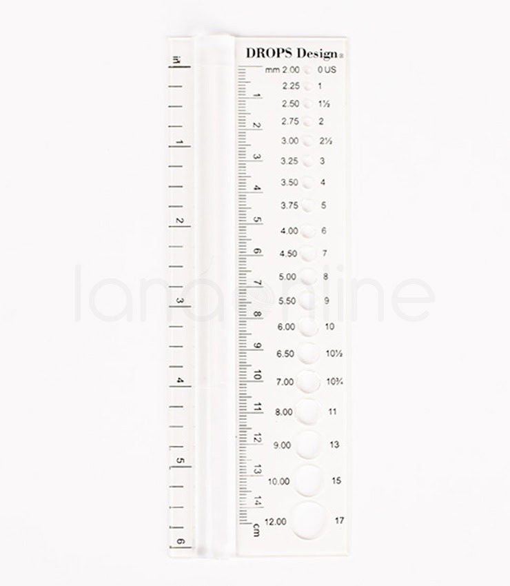 Il righello misuratore per i ferri DROPS, è un utile strumento-calibro per definire o individuare la misura/diametro di ferri da 2,00 mm a 12,00 mm. Inoltre con lo stesso righello, dotato di lente di ingrandimento, è possibile misurare parte del lavoro svolto o contare i punti. È realizzato in plastica bianca e trasparente, leggero e pratico da portare sempre nella tua borsa portalavoro!